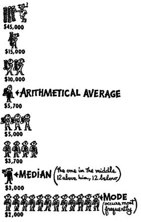 โดยทั่วไปเราจะใช้ค่าเฉลี่ยที่คำนวณจากผลรวมของข้อมูลหารด้วยจำนวนข้อมูลทั้งหมด แต่จริงๆแล้ว ค่าเฉลี่ยแบบนี้อาจทำให้การแสดงข้อมูลถูกบิดเบือนได้ เหมือนในตัวอย่างด้านล่างนี้