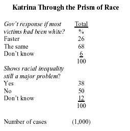 ลองดูผลสำรวจของชาวอเมริกันที่ถามว่า ในช่วงที่เกิดพายุเฮอร์ริเคนแคทรีนา รัฐบาลอเมริกาดูแลคนผิวขาวและคนผิวสีเท่าเทียมกันหรือไม่