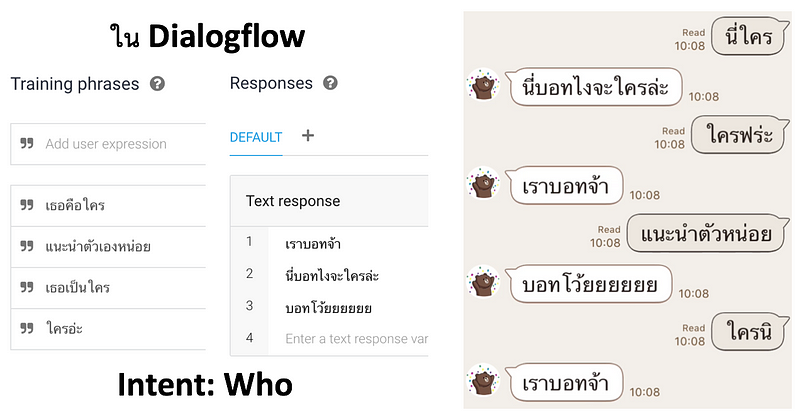 จากรูปด้านซ้ายใน Dialogflow เราใส่ประโยคตัวอย่าง (Training phases) ไป 4 ประโยคสำหรับ Intent:Who เพื่อถามว่าบอทคือใคร และกำหนดคำตอบ (Responses) สำหรับ Intent นี้ไว้ 3 แบบ