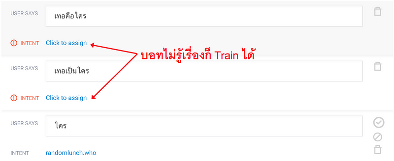 หรือถ้าบอทเจอประโยคที่ไม่เข้าใจ เราก็สามารถ train บอทได้โดยเลือก Intent ให้กับข้อความที่บอทงง