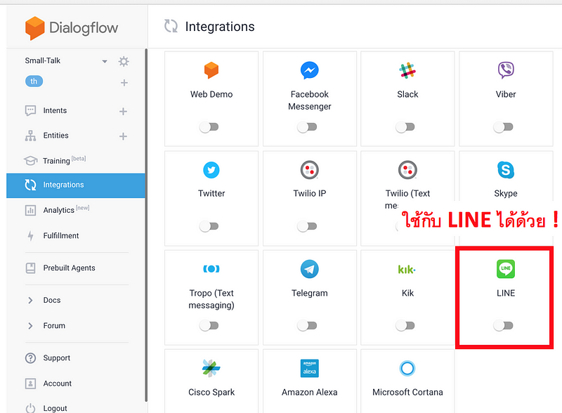 Dialogflow ไม่ได้ออกแบบมาเพื่อใช้บนแอพใดแอพหนึ่งเท่านั้น มันสามารถต่อกับอุปกรณ์ (Google Assistant, Amazon Alexa) และ Chat platform อื่นๆได้มากมาย รวมทั้ง LINE ด้วยจ้า ซึ่งตอนนี้ Google เปิดให้ใช้กันฟรีๆเลย