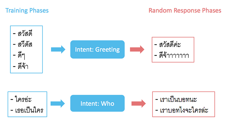 ใน Dialogflow เราสามารถจัดกลุ่มประโยคที่มีความต้องการ (Intent) เหมือนกันให้บอทเรียนรู้ และกำหนดคำตอบสำหรับแต่ละ Intent ได้ ถ้าคำตอบที่เรากำหนดไว้มีหลายแบบ Dialogflow จะสุ่มเลือกคำตอบให้เอง