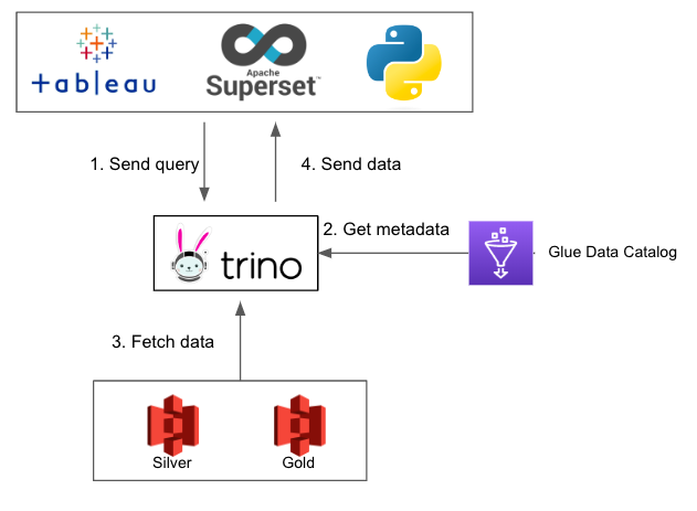การทำงานก็คล้ายๆ กับที่อธิบายไปข้างต้นค่ะ เรา setup Trino ให้ต่อกับ Glue Catalog ทีนี้พอมี query เรียก Iceberg table มันก็จะวิ่งไปหา Glue ก่อนให้ได้ metadata file มา จากนั้น Trino เองก็จะรู้แล้วว่าต้องไปอ่าน file ไหนเพื่อส่งออกมาเป็น table ให้ user