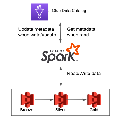 ทีนี้เวลามีคนมาอ่าน table นี้ Glue ก็จะให้ metadata file นี้ไปซึ่งในนี้จะบอกว่าต้องไปอ่าน data file ไหนเพื่อให้ได้ข้อมูลที่ต้องการ การทำงานระหว่าง S3, Spark, Glue จะประมาณรูปด้านล่างค่ะ