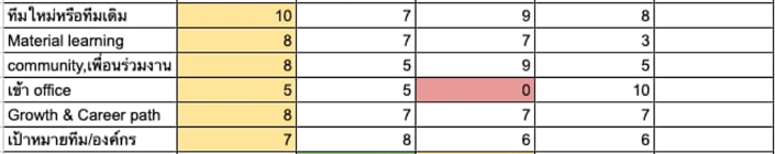 โดยคุณนอร์ทยังได้แชร์ว่า ลองทำตารางให้คะแนนเวลาที่ได้ไปสัมภาษณ์งานกับหลายๆบริษัทดูตามรูปด้านล่าง โดยสีเหลืองคือ weight ที่เราให้กับหัวข้อนั้นๆ พอรวมคะแนนออกมาอาจจะทำให้เราตัดสินใจได้ง่ายขึ้น (ขอโทษด้วย ลืมครอปหัวมา)